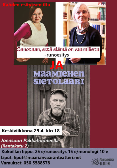 Tänään ke 29.4. kahden esityksen ilta Pakkahuoneella klo 18 Tervetuloa!